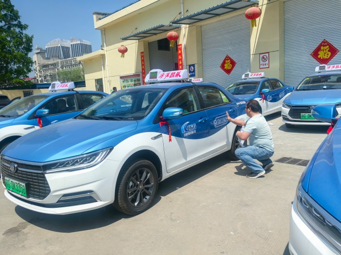 4月29日,汽服公司出租汽车事业部院内停车场地上一派热闹繁忙景象,管理人员正在抓紧时间对即将上路营运的8台新能源出租车进行全面检查,车内专用服务设施设备齐备,运转正常。巡游出租汽车顶灯、95128统一叫车热线、企业Logo等规范服务标识在崭新车身一一展现,不仅方便乘客识别与求助,更彰显着国企出租公司专业形象。