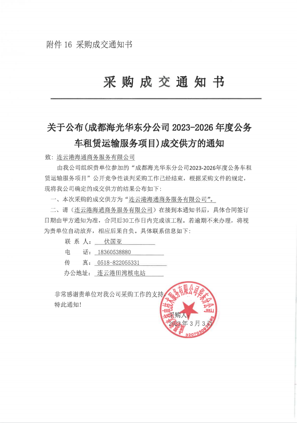 日前,汽服海通商务公司收到采购成交通知书,成功中标成都海光华东分公司公务车租赁运输服务项目。