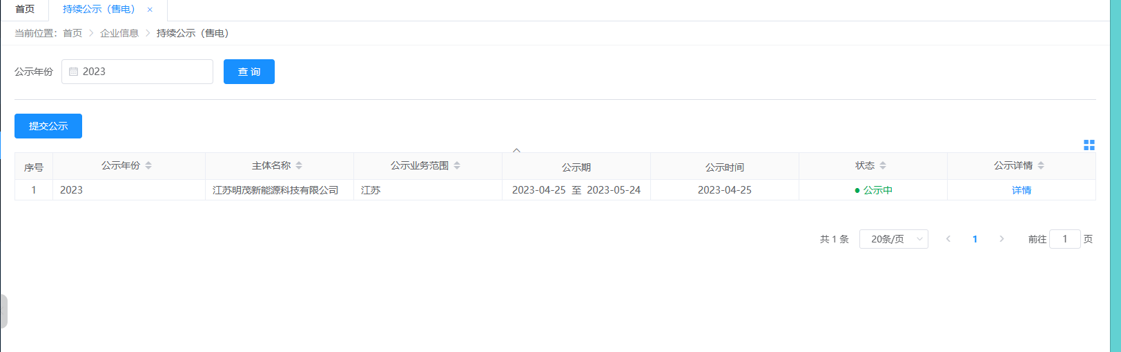 4月25日,明茂公司综合能源事业部完成江苏电力交易中心年度持续公示工作。 本次公示工作主要将售电公司每年自主公开满足入市的售电公司主体数据写入到年度公示表中,供售电公司年度公示数据展示,公示数据包括企业信息,股权信息,从业人员信息,资产信息,场所信息,电力市场技术支持系统信息,信用信息附件等数据。