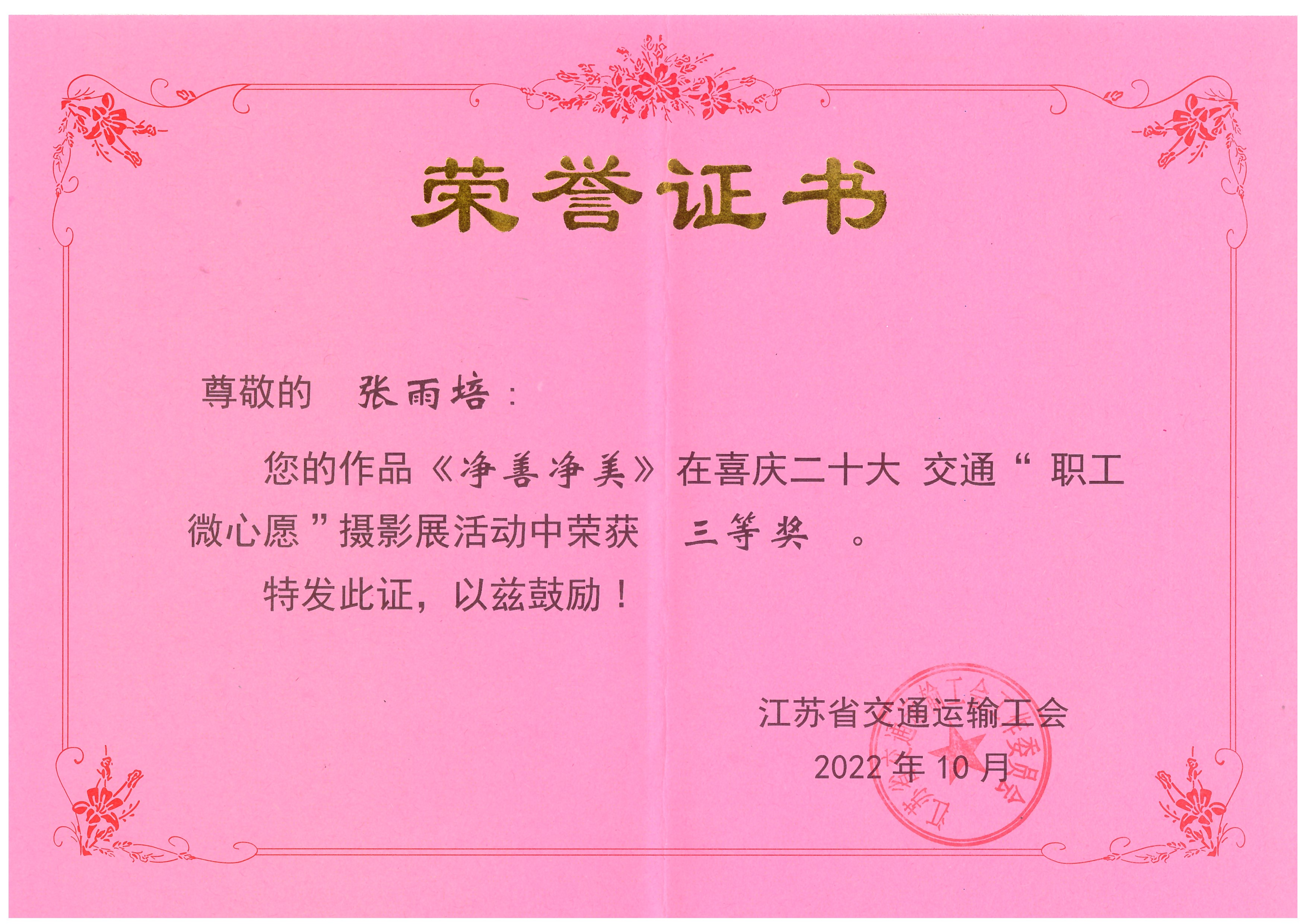 近日,从江苏省交通运输工会传来喜讯,连云港市公交星空app最新版下载,星空(中国)职工张雨培的摄影作品《净善净美》在喜庆二十大交通“职工微心愿”摄影展活动中荣获“三等奖”。